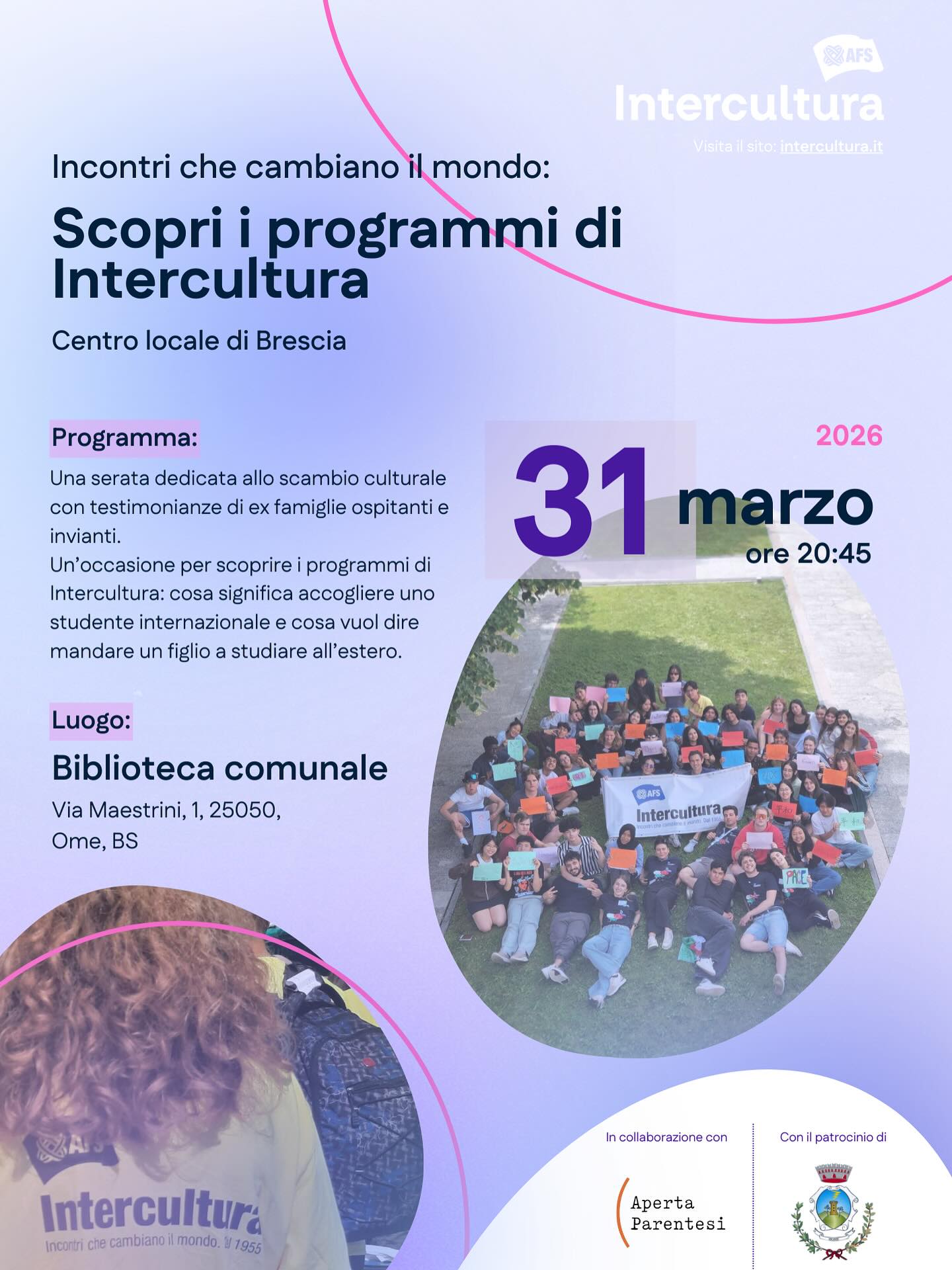 Descrizione Vieni a scoprire le proposte di AFS - Intercultura Brescia - Intercultura martedì 31 in Biblioteca Di Ome.In collaborazione con ApertaParentesi