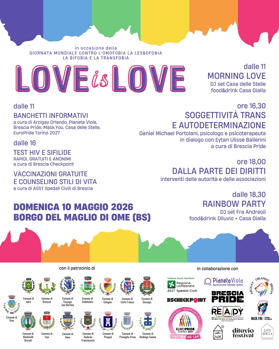In occasione della giornata contro l'omofobia, la lesbofobia, la bifobia e la transfobia... Domenica 10 maggio al Borgo del Maglio di Ome LOVE IS LOVE.