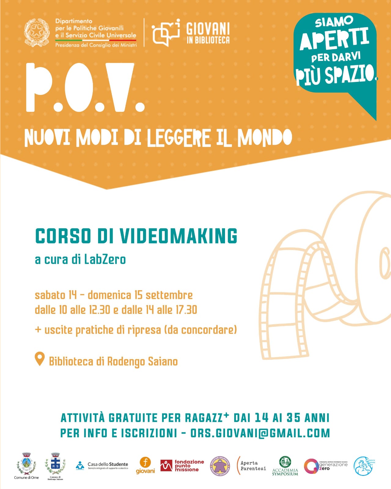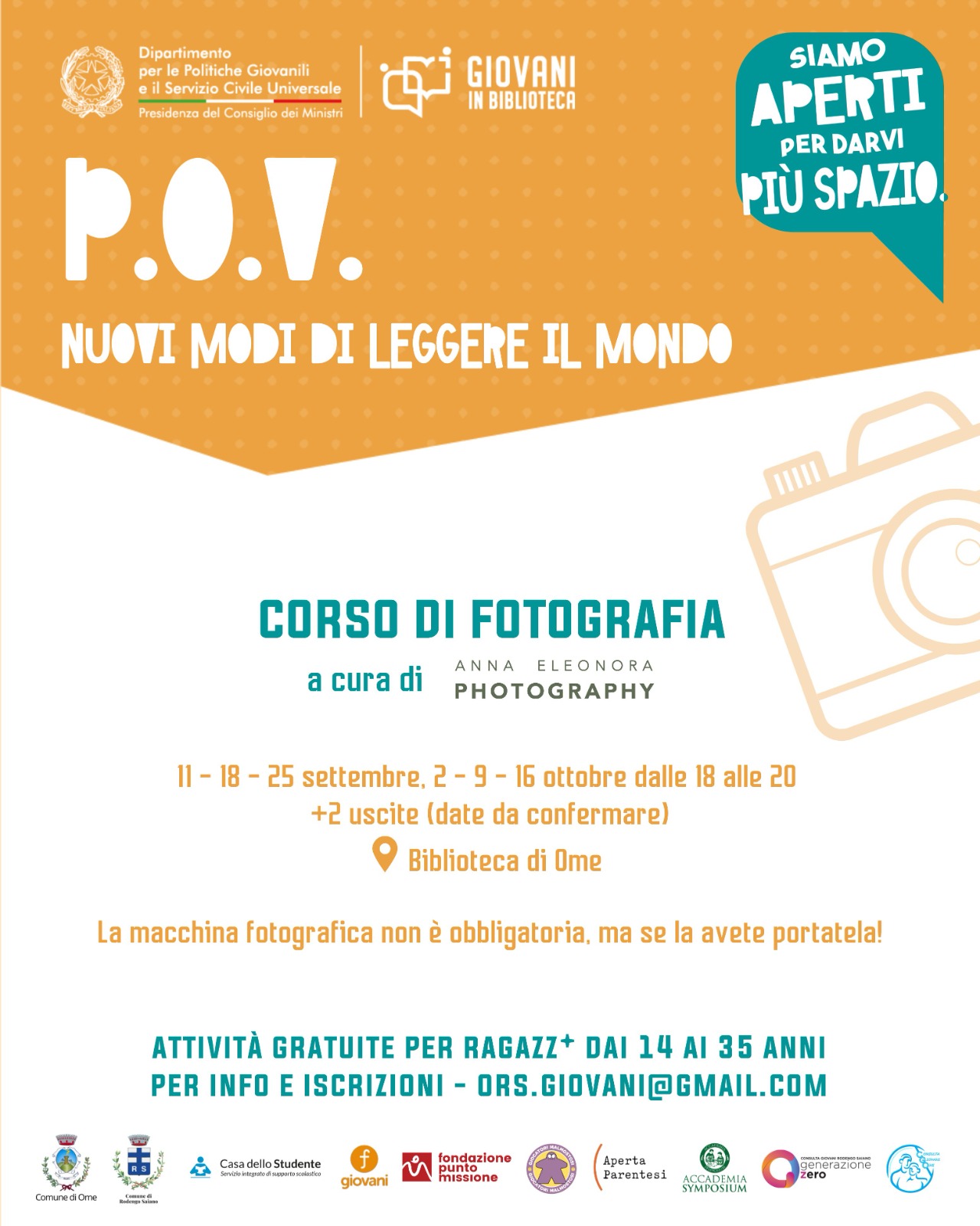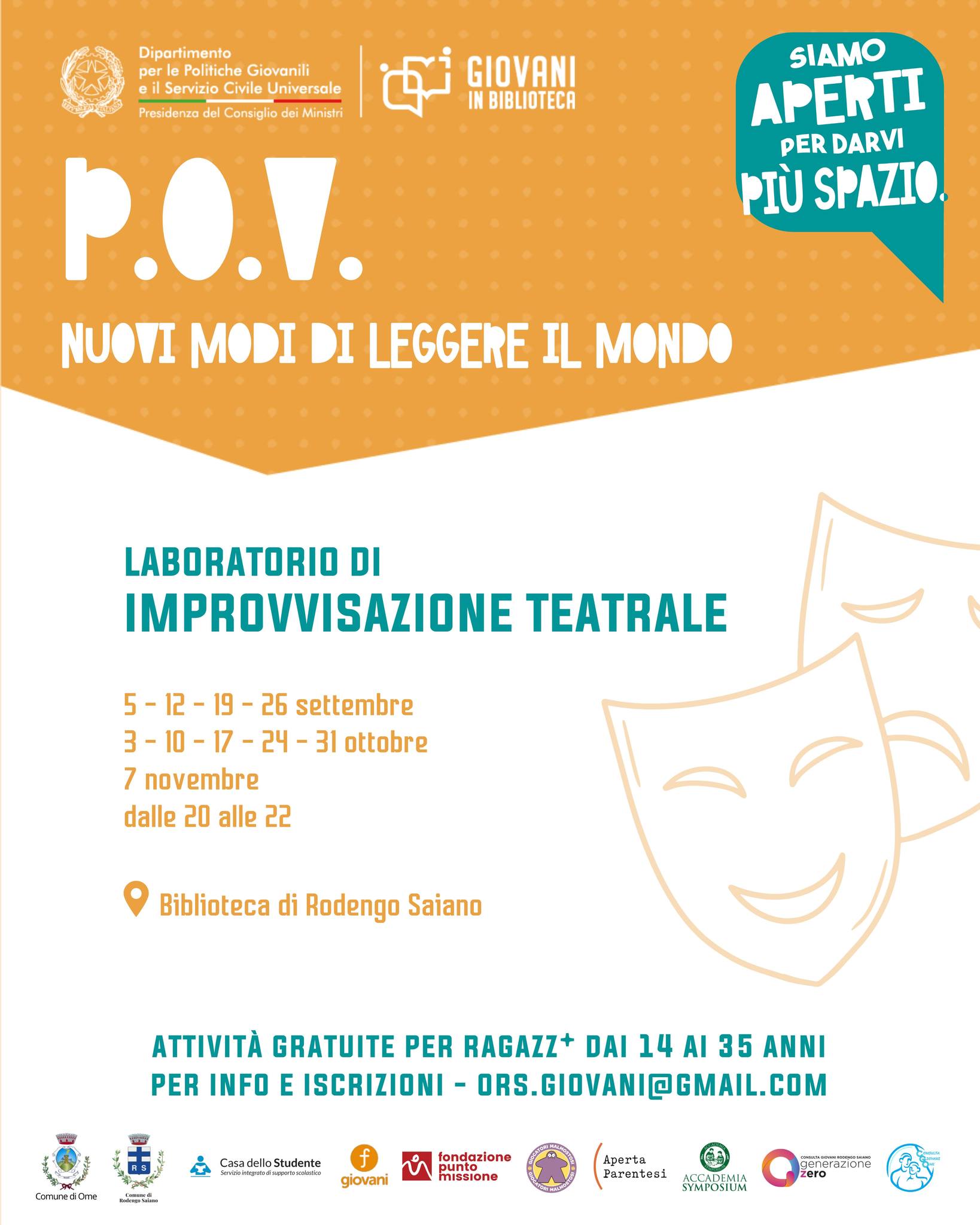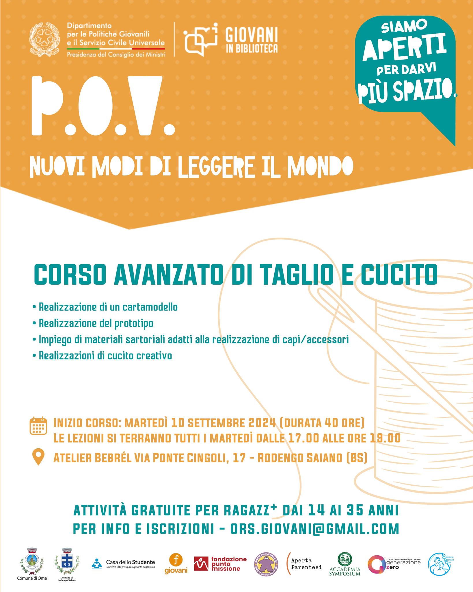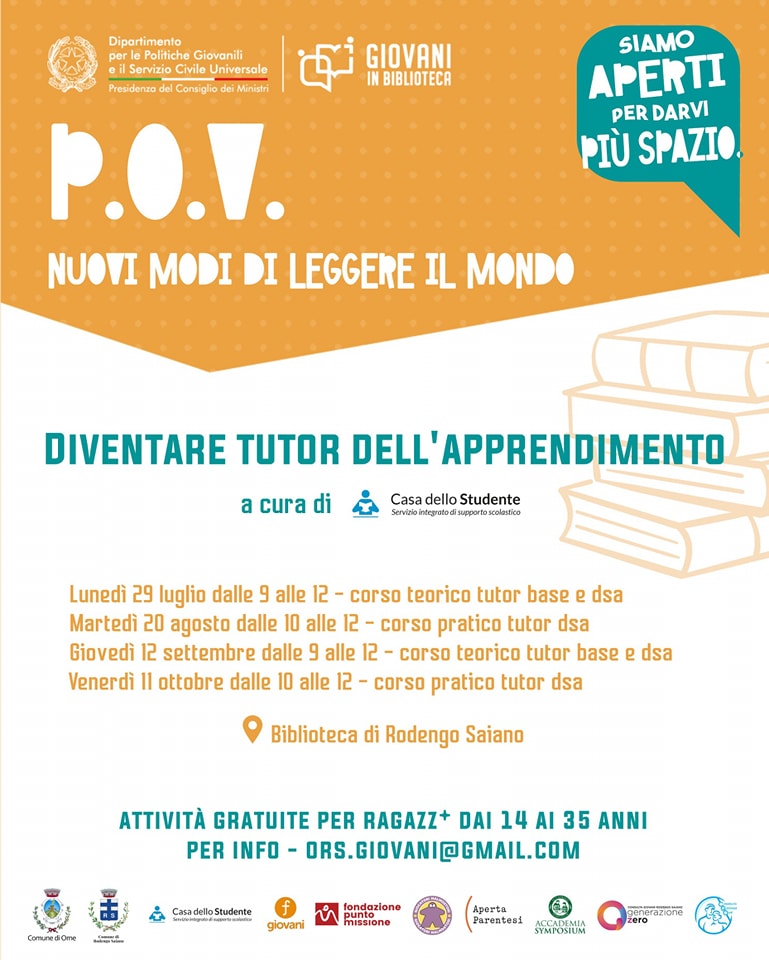 Continuano le proposte del progetto “P.O.V.: nuovi modi di leggere il mondo”, un intero anno di attività gratuite per ragazz* dai 14 ai 35 anni in Biblioteca Di Ome e Rodengo Saiano, grazie al finanziamento ottenuto tramite il bando "Giovani in biblioteca" del Dipartimento per le politiche giovanili e il servizio civile universale – Presidenza del Consiglio dei Ministri, in rete con il Comune di Rodengo Saiano.In partenza laboratori gratuiti di fotografia, video-making e improvvisazione teatrale, corsi di cucito e tutor dell'apprendimento. Tutte le info nelle locandine!Punto Missione, Casa dello Studente - Ripetizioni, Improvvisazione teatrale Brescia, Lab_Zero, Anna Eleonora Photography.