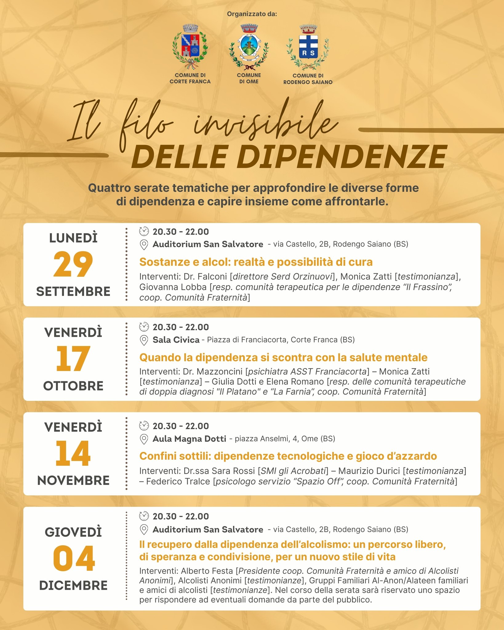 Voci personali, testimonianze dirette e il punto di vista di professionisti e professioniste che operano e lavorano accanto a chi vive una dipendenza. Serate organizzate dai Comuni di Corte Franca, Ome e Rodengo Saiano, in collaborazione con enti pubblici e privati, e associazioni di auto mutuo aiuto.